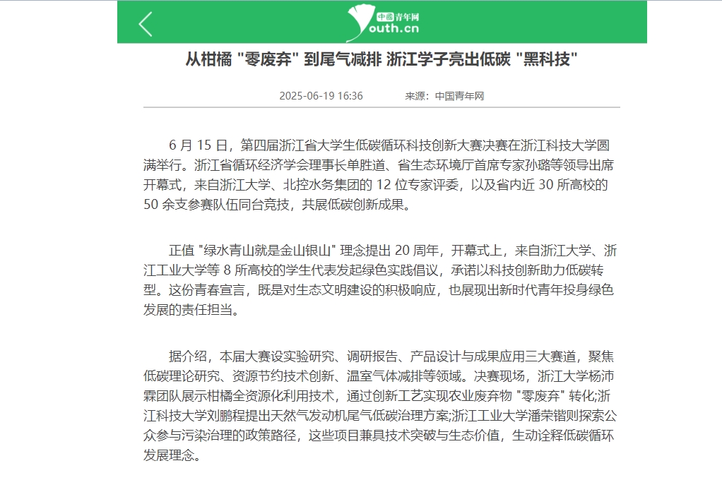 中国青年网:从柑橘 "零废弃" 到尾气减排 浙江学子亮出低碳 "黑科技"
