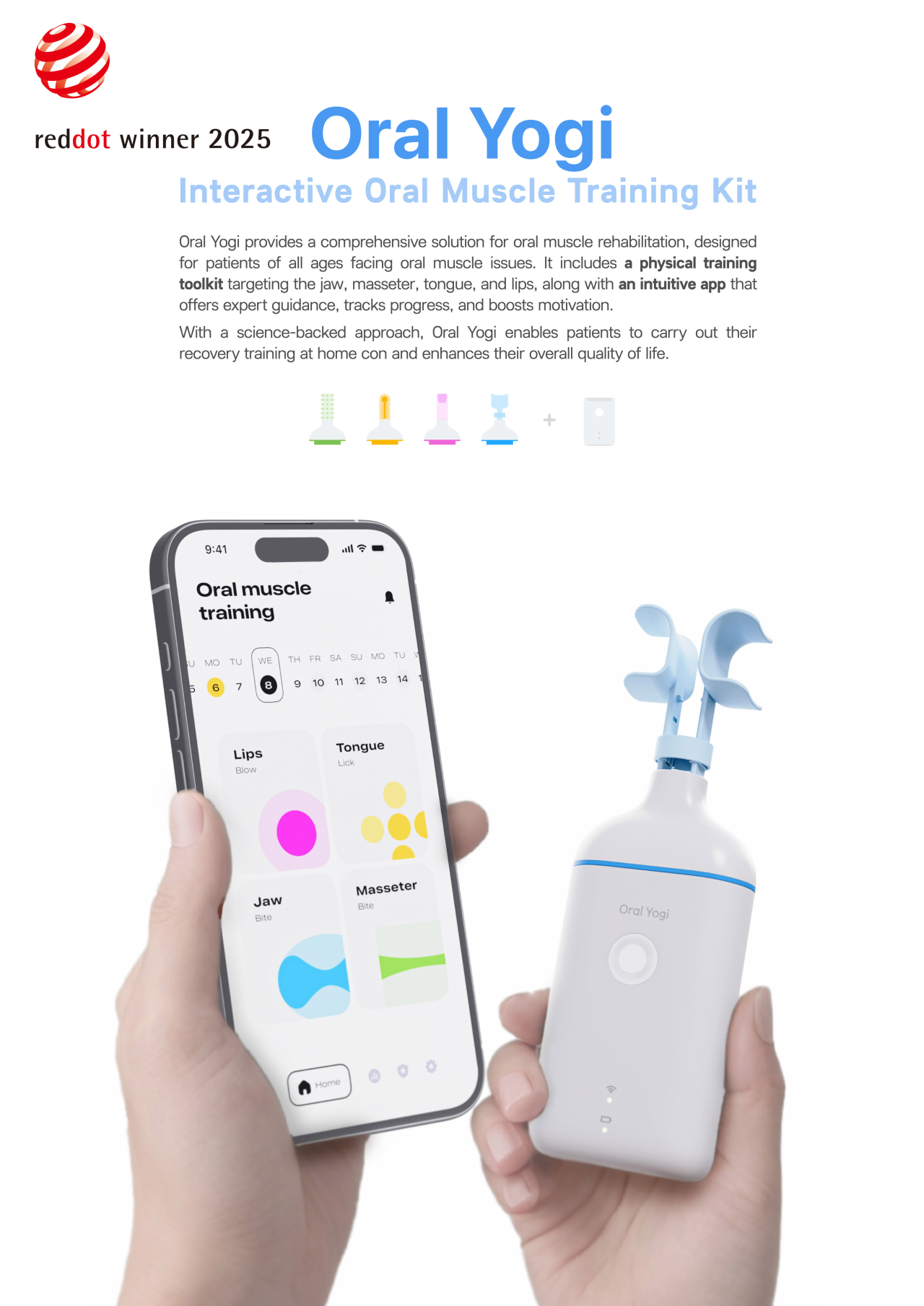 设计说明:Oral Yogi 针对各年龄段口腔肌肉问题人群,打造实体工具包 + 智能 APP” 一体化方案。工具包覆盖下颚、颞肌、舌头、嘴唇训练;APP 提供专业指导、进度跟踪与激励。产品适配多类场景,患者无需往返机构,在家、外出均可训练,有效改善咀嚼、吞咽、发音等功能,助力提升整体生活质量。